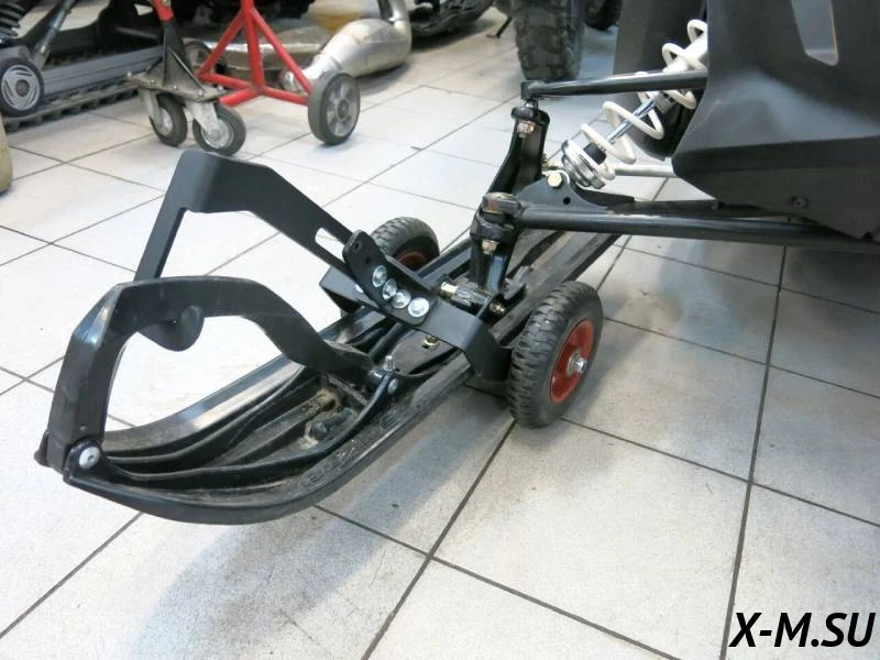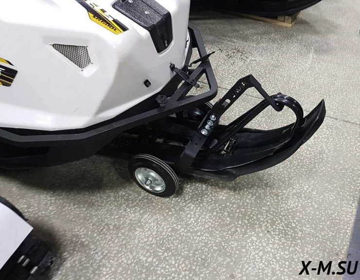 Разместите тележку под лыжей и приподнимите лыжу при помощи рукоятки. После этого заведите снегоход и перевезите его в нужное место.